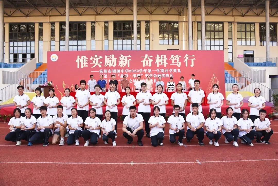 9月6日下午,意昂体育社区慈善基金会理事长孙伟荣、理事许素萍受邀参加了塘栖中学举办的2022学年第一学期开学典礼暨第二届“晶彩·雏鹰”奖学金颁奖典礼。