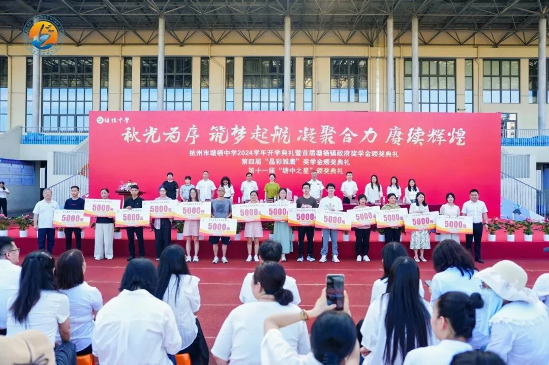 9月9日下午,意昂体育社区慈善基金会理事长孙伟荣先生和理事许素萍女士受邀出席塘栖中学2024学年第一学期开学典礼。塘栖中学副书记、副校长闫永吉,副校长胡春英,副校级视导员吴江林分别宣读了第四届“晶彩雏鹰”奖学金获奖名单、“第十一届塘中之星”表彰名单和“塘栖镇镇政府奖学金”获得者名单。理事长孙伟荣为获奖学生颁奖并合影留念。